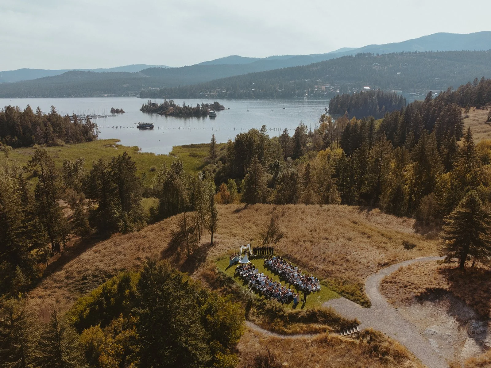 With thoughtful renovations and a focus on preserving its timeless elegance, the Somers Mansion now boasts seven luxurious guest suites, a grand ballroom, a state-of-the-art kitchen, and a sophisticated East Cocktail Lawn. The ceremony meadow overlooking the stunning Flathead Lake and the charming Carriage House event space make it the perfect venue for any special occasion. The Somers Mansion is truly a unique Montana wedding venue.